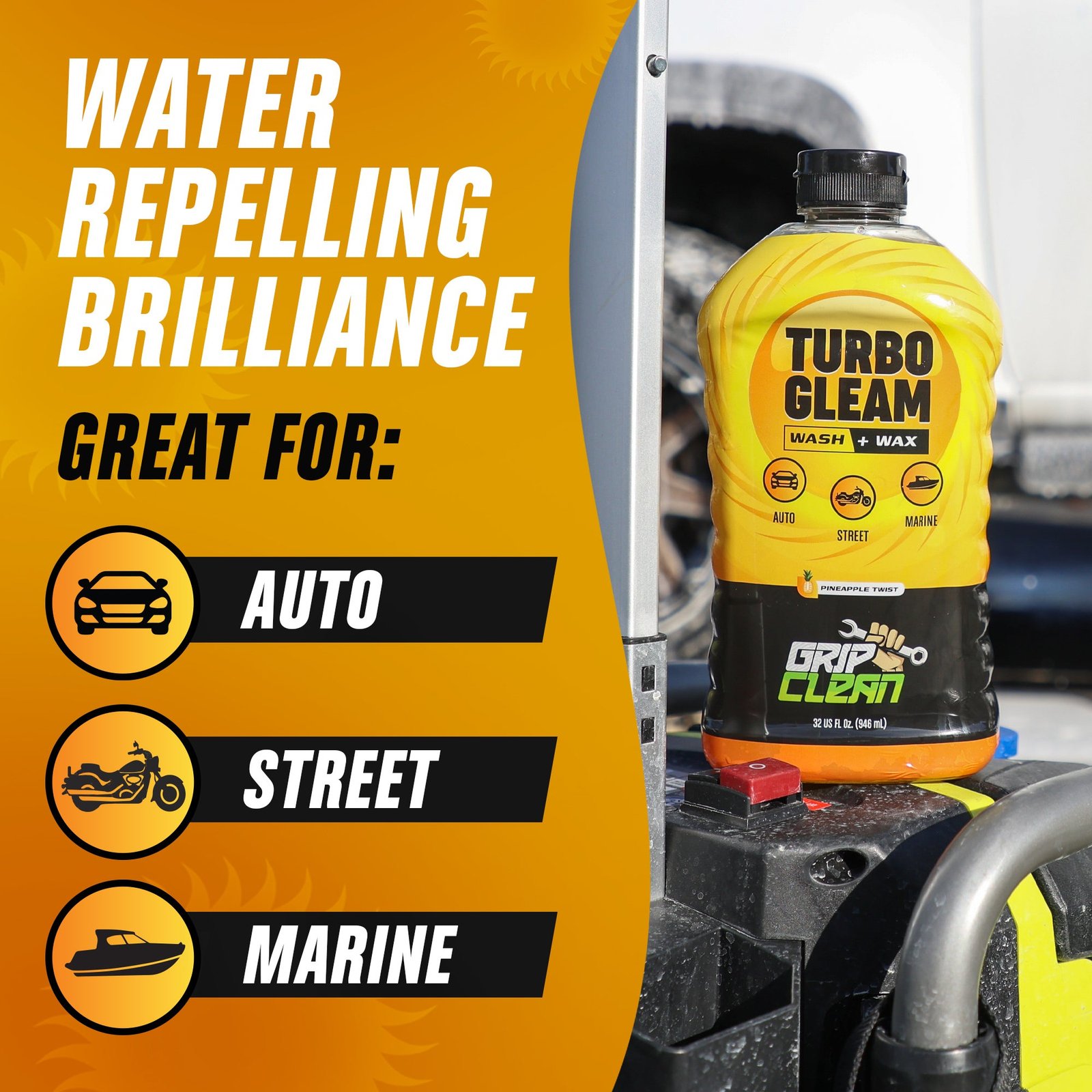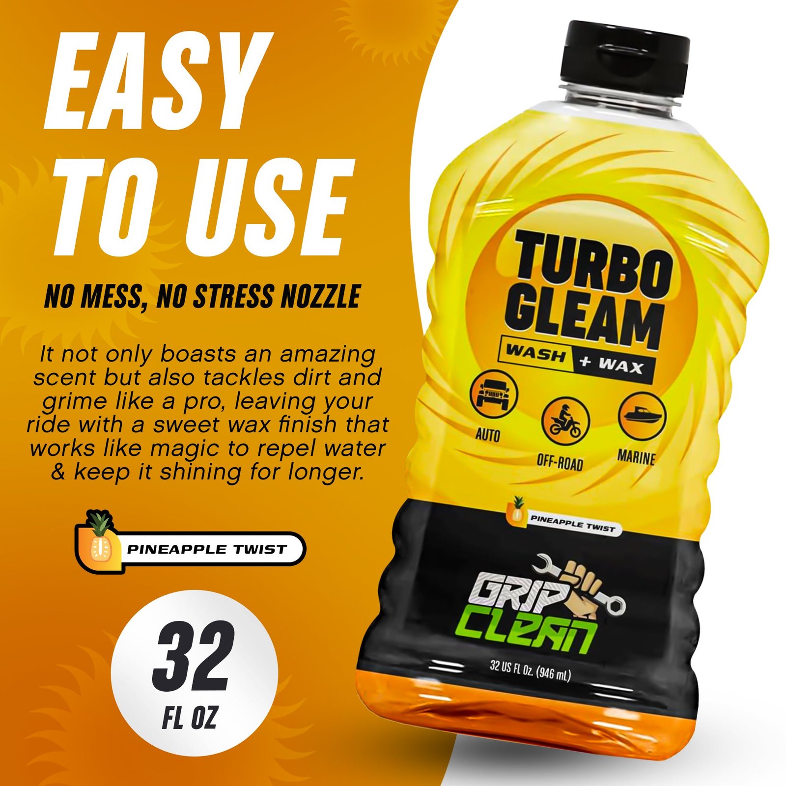 Get ready for a car care experience like no other with TurboGleam! This top-notch car wash soap isn’t just your average wash and wax. It not only boasts an amazing scent but also tackles dirt and grime like a pro, leaving your ride with a sweet wax finish that works like magic to repel water and keep it shining for longer. Whether you prefer the classic bucket method or love the foam cannon vibes, TurboGleam makes it all a breeze. Elevate your car shine game with TurboGleam—because your ride deserves nothing but the royal treatment!